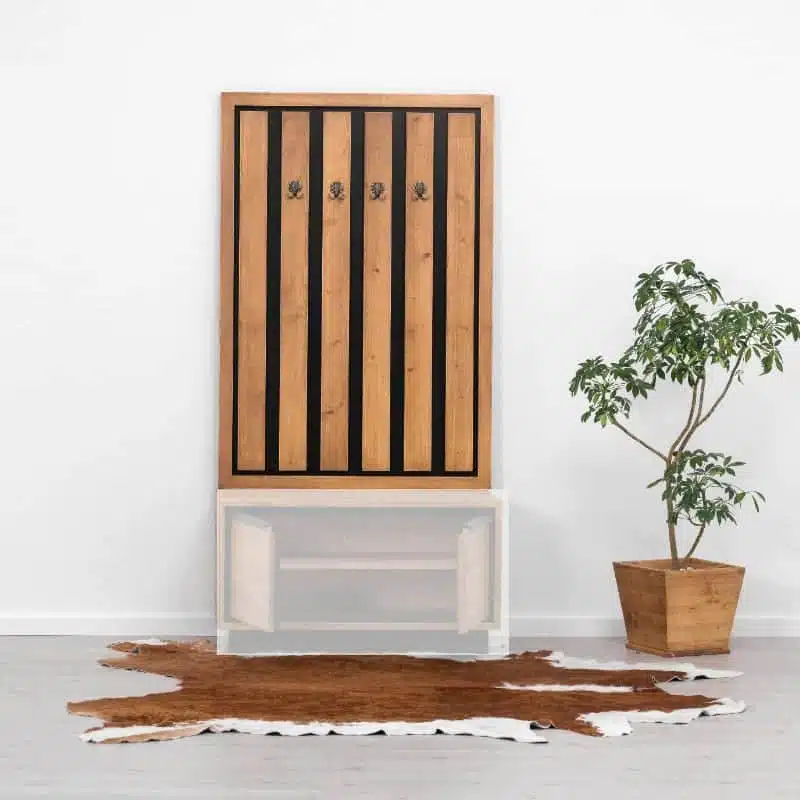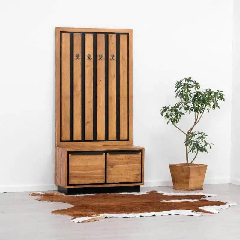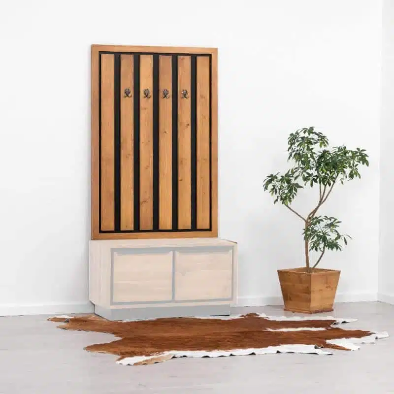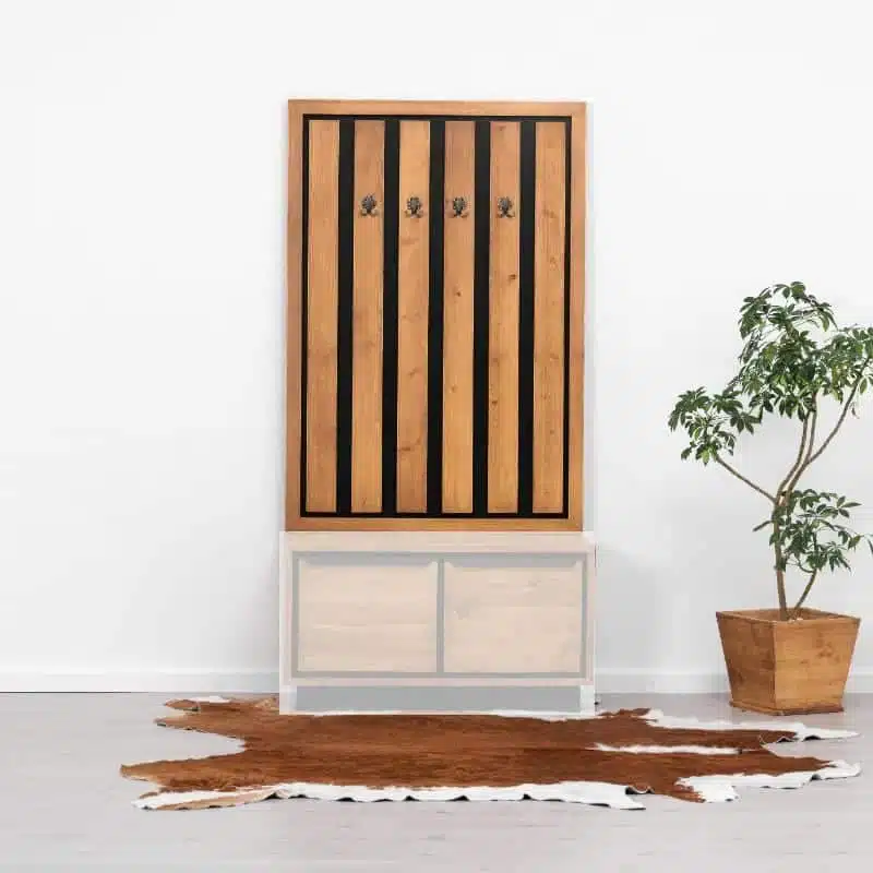Il legno utilizzato per la produzione dei mobili presenta nodi visibili, crepe e segni di sega, che conferiscono un effetto invecchiato e rendono ogni pezzo unico. Degna di nota è la calda tonalità del legno, ottenuta tramite l’applicazione di una patina oleosa.