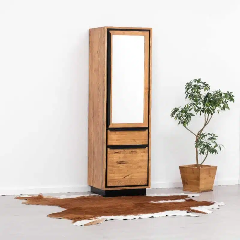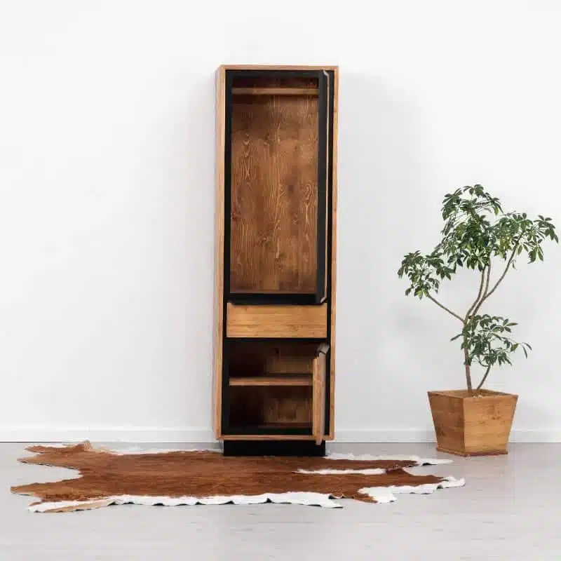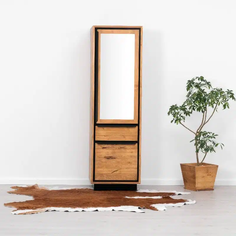 Il legno utilizzato per la produzione dei mobili presenta nodi visibili, crepe e segni di sega, che conferiscono un effetto invecchiato e rendono ogni pezzo unico. Degna di nota è la calda tonalità del legno, ottenuta tramite l’applicazione di una patina oleosa.