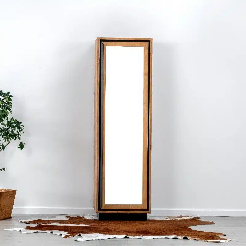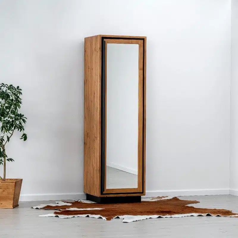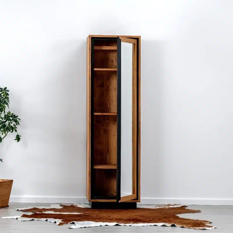 Il legno utilizzato per la produzione dei mobili presenta nodi visibili, crepe e segni di sega, che conferiscono un effetto invecchiato e rendono ogni pezzo unico. Degna di nota è la calda tonalità del legno, ottenuta tramite l’applicazione di una patina oleosa.