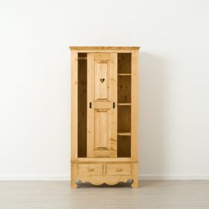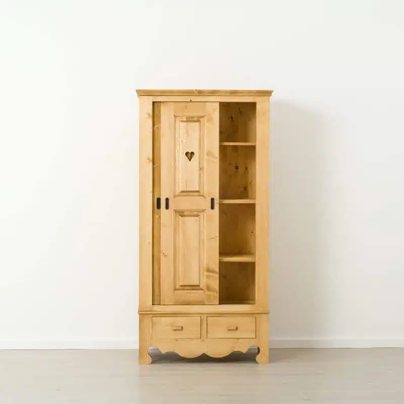 • Particolaritร : Maniglie in legno sui cassetti; zoccolo lavorato;ย cuori sulle ante scorrevoli