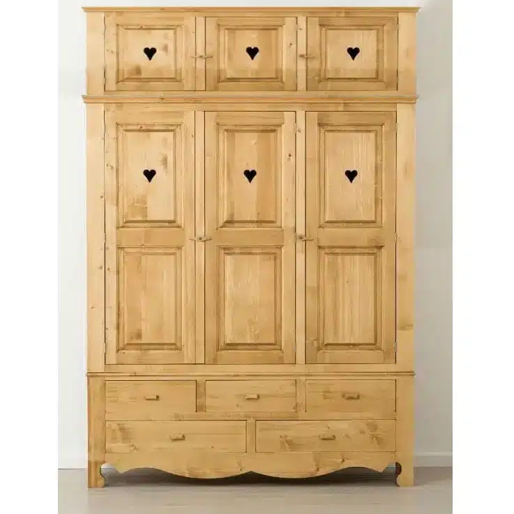 Lโambiente Chamonix รจ tipico delle abitazioni di montagna.ย Caratteristiche della collezione sono lo zoccolo lavorato e la presenza di maniglie/pomoli in legno e dei cuori sulle ante. Tutti gli articoli della linea vengono realizzati al 100% in LEGNO MASSELLO di ABETE, non ci sono parti in compensato/truciolare; anche il retro e il fondo dei cassetti.