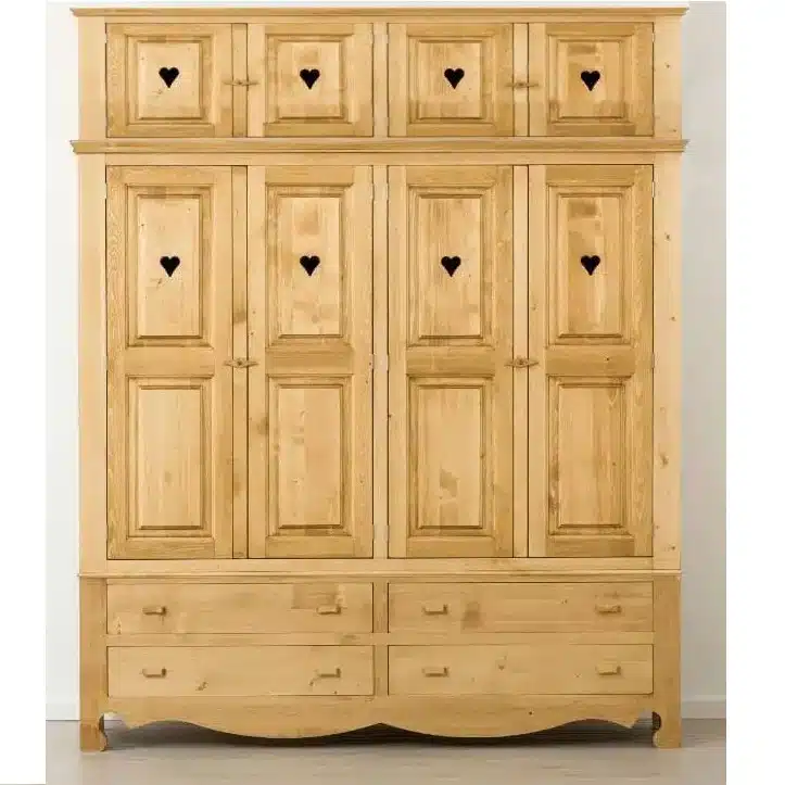 Lโambiente Chamonix รจ tipico delle abitazioni di montagna.ย Caratteristiche della collezione sono lo zoccolo lavorato e la presenza di maniglie/pomoli in legno e dei cuori sulle ante. Tutti gli articoli della linea vengono realizzati al 100% in LEGNO MASSELLO di ABETE, non ci sono parti in compensato/truciolare; anche il retro e il fondo dei cassetti.