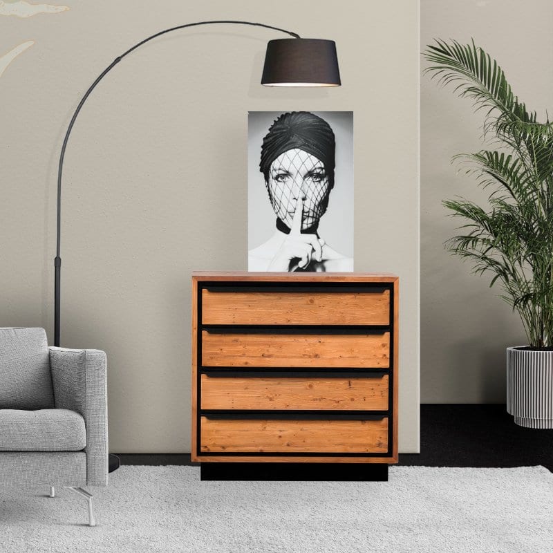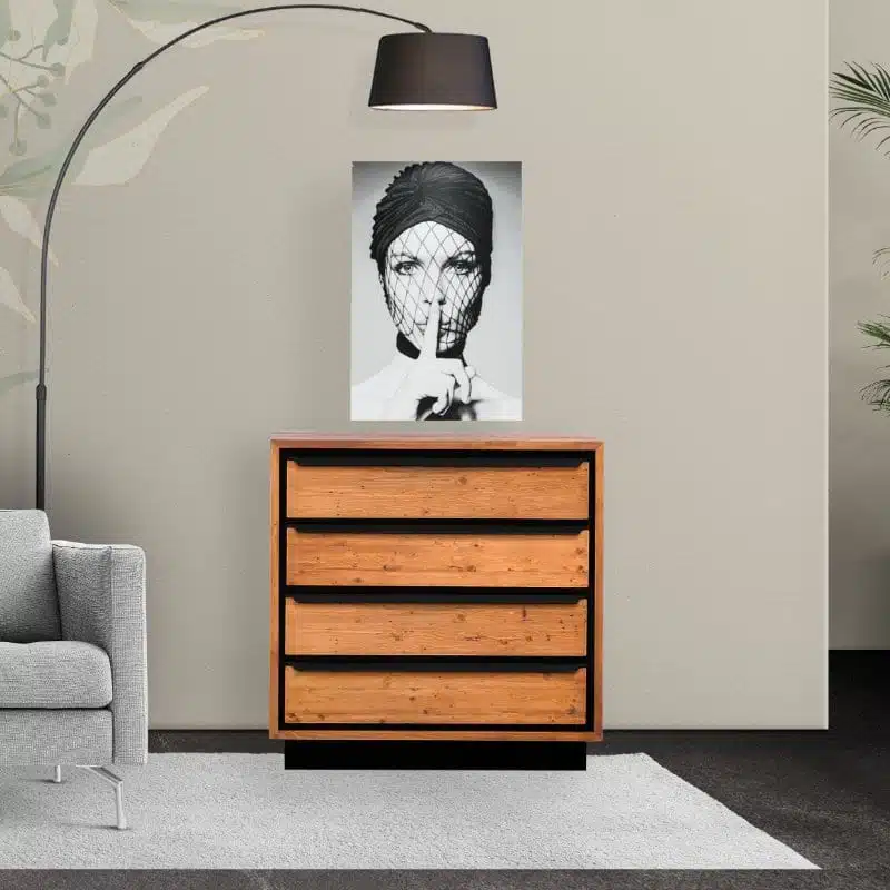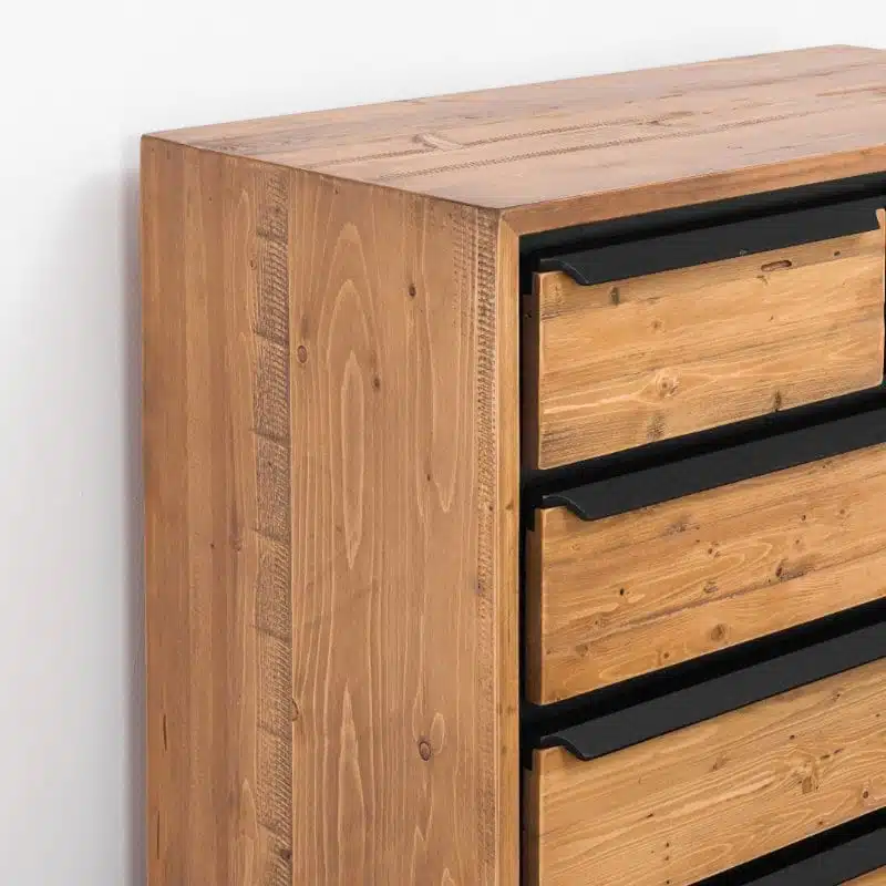 Il legno utilizzato per la produzione dei mobili presenta nodi visibili, crepe e segni di sega, che conferiscono un effetto invecchiato e rendono ogni pezzo unico. Degna di nota è la calda tonalità del legno, ottenuta tramite l’applicazione di una patina oleosa.