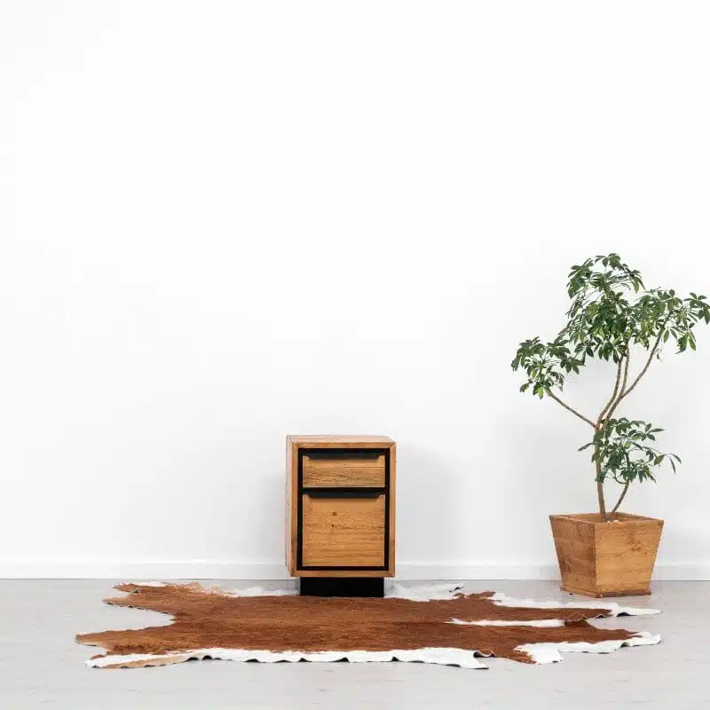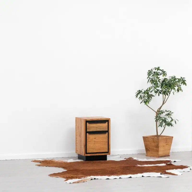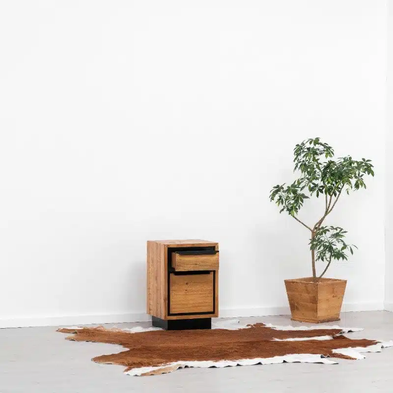 Il legno utilizzato per la produzione dei mobili presenta nodi visibili, crepe e segni di sega, che conferiscono un effetto invecchiato e rendono ogni pezzo unico. Degna di nota è la calda tonalità del legno, ottenuta tramite l’applicazione di una patina oleosa.