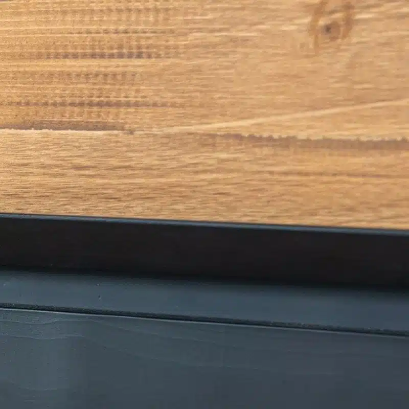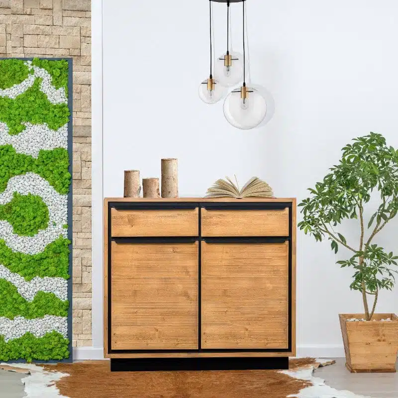 Il legno utilizzato per la produzione dei mobili presenta nodi visibili, crepe e segni di sega, che conferiscono un effetto invecchiato e rendono ogni pezzo unico. Degna di nota è la calda tonalità del legno, ottenuta tramite l’applicazione di una patina oleosa.