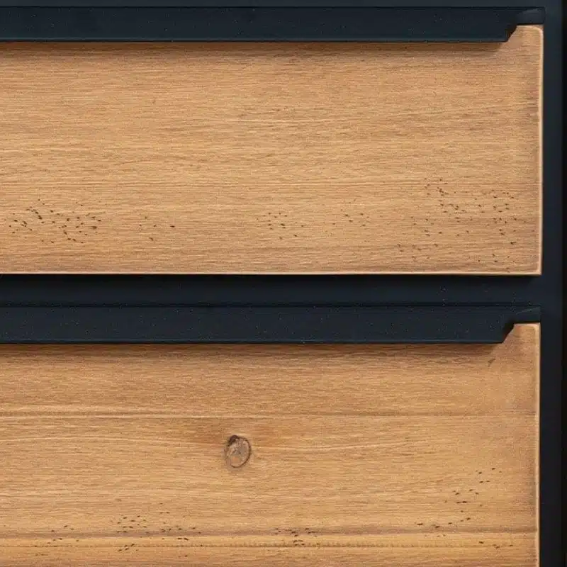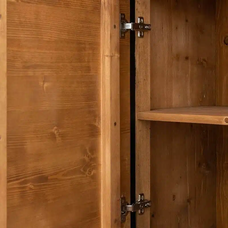 Il legno utilizzato per la produzione dei mobili presenta nodi visibili, crepe e segni di sega, che conferiscono un effetto invecchiato e rendono ogni pezzo unico. Degna di nota è la calda tonalità del legno, ottenuta tramite l’applicazione di una patina oleosa.