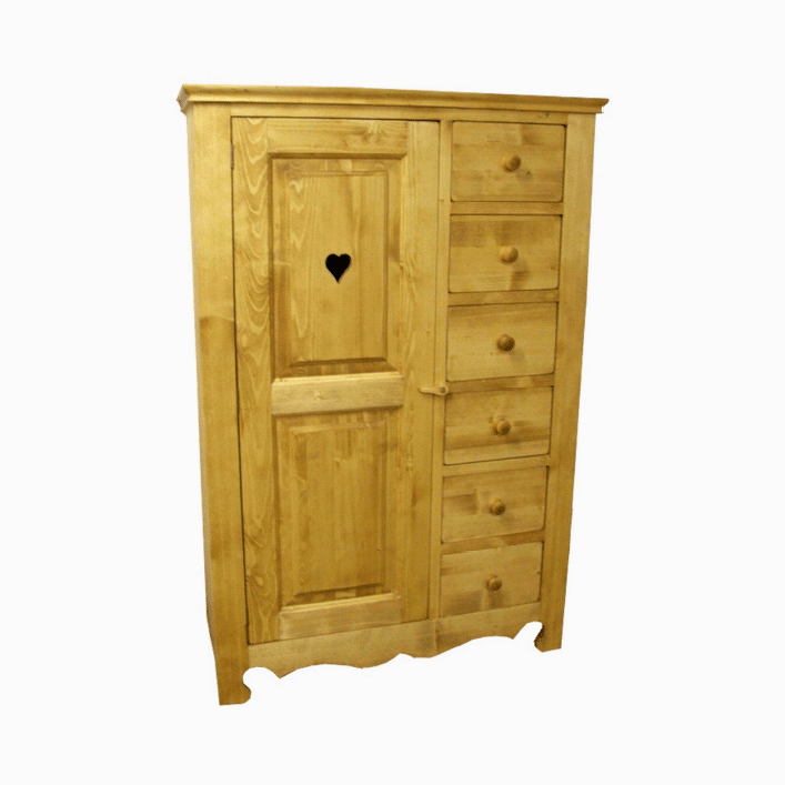 Lโambiente Chamonix รจ tipico delle abitazioni di montagna.ย Caratteristiche della collezione sono lo zoccolo lavorato e la presenza di maniglie/pomoli in legno e dei cuori sulle ante. Tutti gli articoli della linea vengono realizzati al 100% in LEGNO MASSELLO di ABETE, non ci sono parti in compensato/truciolare; anche il retro e il fondo dei cassetti.