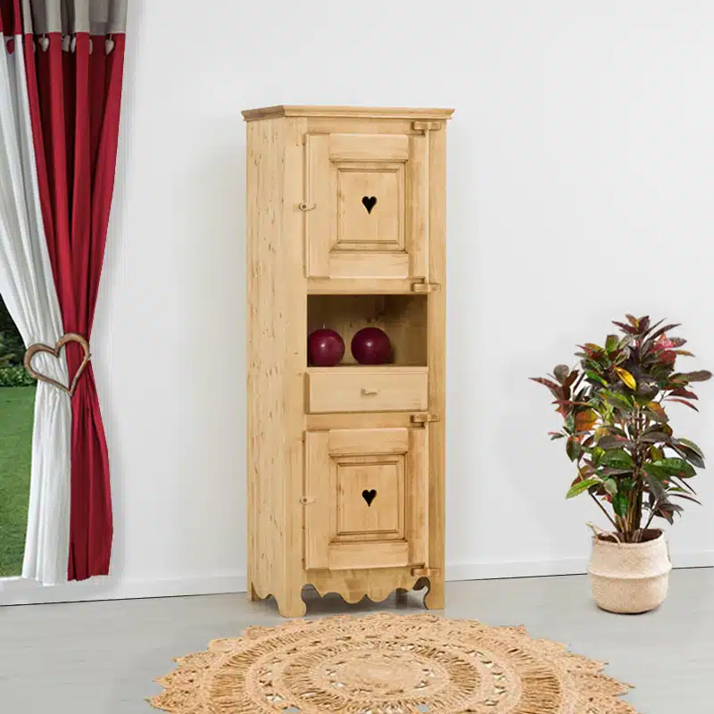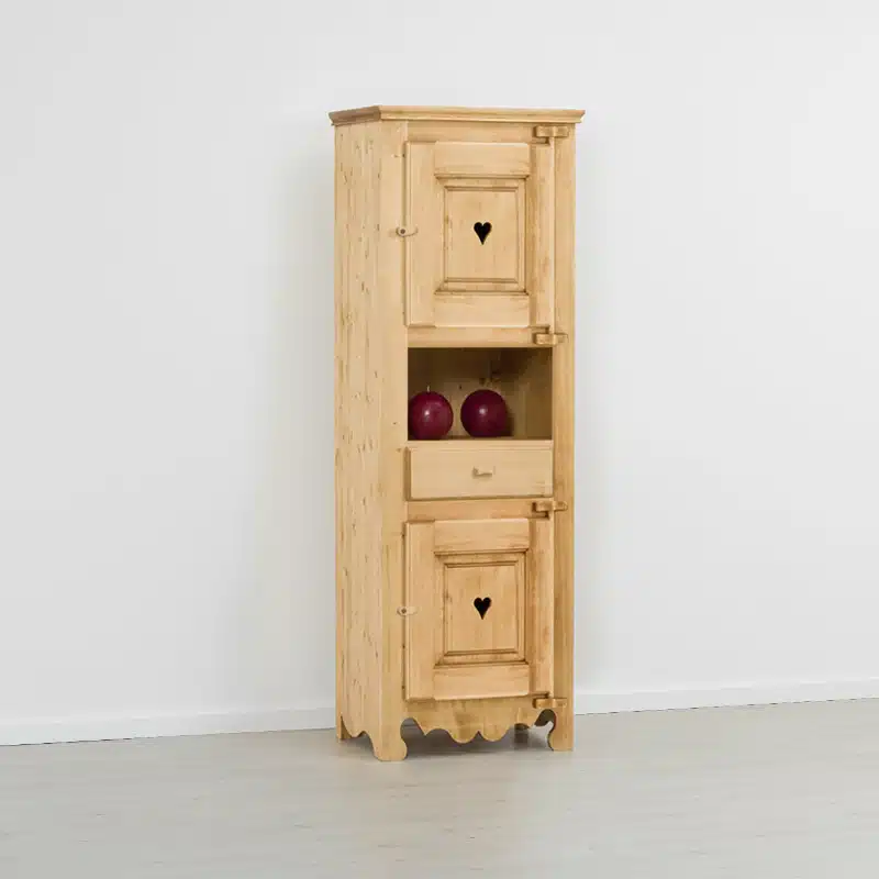 Lโambiente Chamonix รจ tipico delle abitazioni di montagna.ย Caratteristiche della collezione sono lo zoccolo lavorato e la presenza di maniglie/pomoli in legno e dei cuori sulle ante. Tutti gli articoli della linea vengono realizzati al 100% in LEGNO MASSELLO di ABETE, non ci sono parti in compensato/truciolare; anche il retro e il fondo dei cassetti.