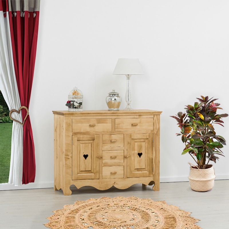 Lโambiente Chamonix รจ tipico delle abitazioni di montagna.ย Caratteristiche della collezione sono lo zoccolo lavorato e la presenza di maniglie/pomoli in legno e dei cuori sulle ante. Tutti gli articoli della linea vengono realizzati al 100% in LEGNO MASSELLO di ABETE, non ci sono parti in compensato/truciolare; anche il retro e il fondo dei cassetti.