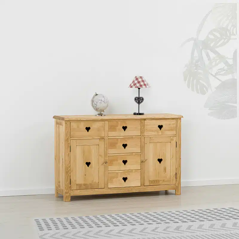 La collezione Megeve evoca il legno nel senso originario del termine. Cuori intagliati tipici di mobili country e rustici tradizionali, la sobrietร dei suoi spessori dร ad ogni ambiente un aspetto accogliente in cui vivere.