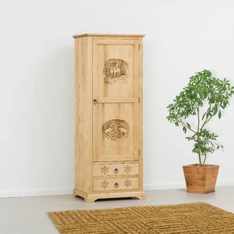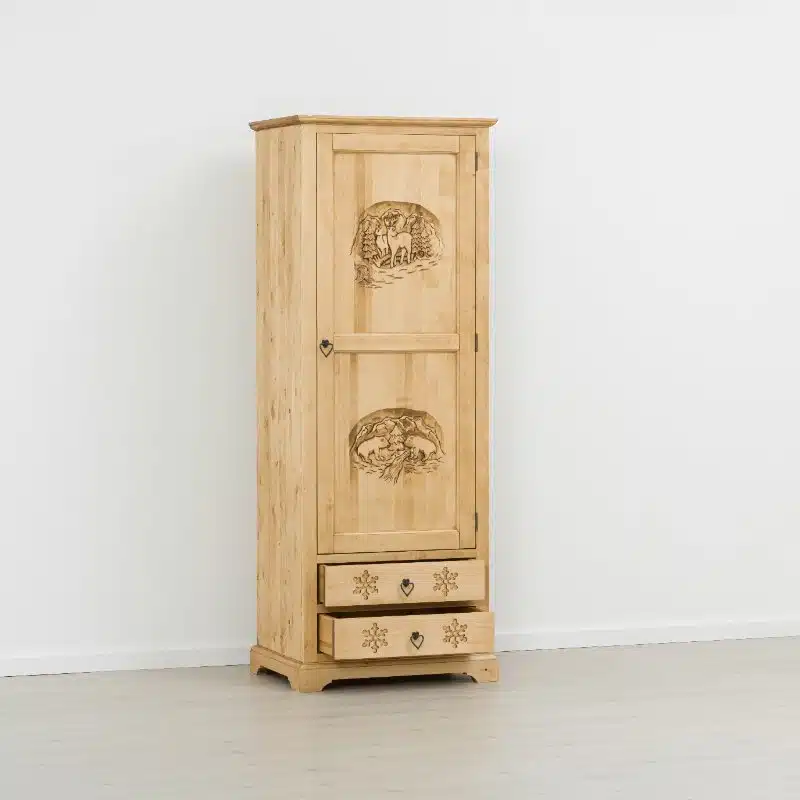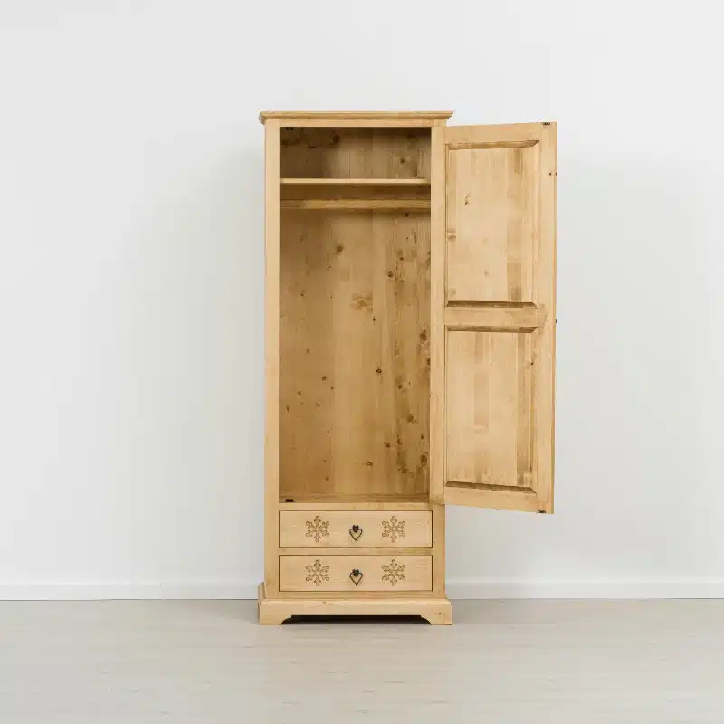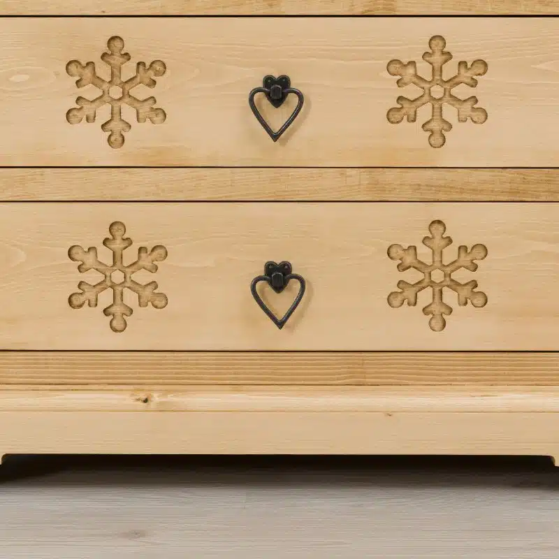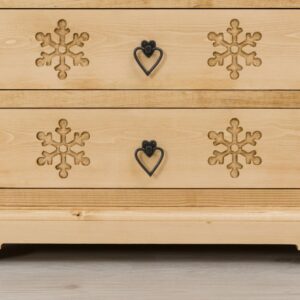 Lโambiente Chalet รจ tipico delle abitazioni di montagna. Lasciatevi incantare dai mobili di questa collezione dalle linee semplici ma impreziosite dagli intarsi fatti rigorosamente a mano e dalle particolari maniglie in ferro.