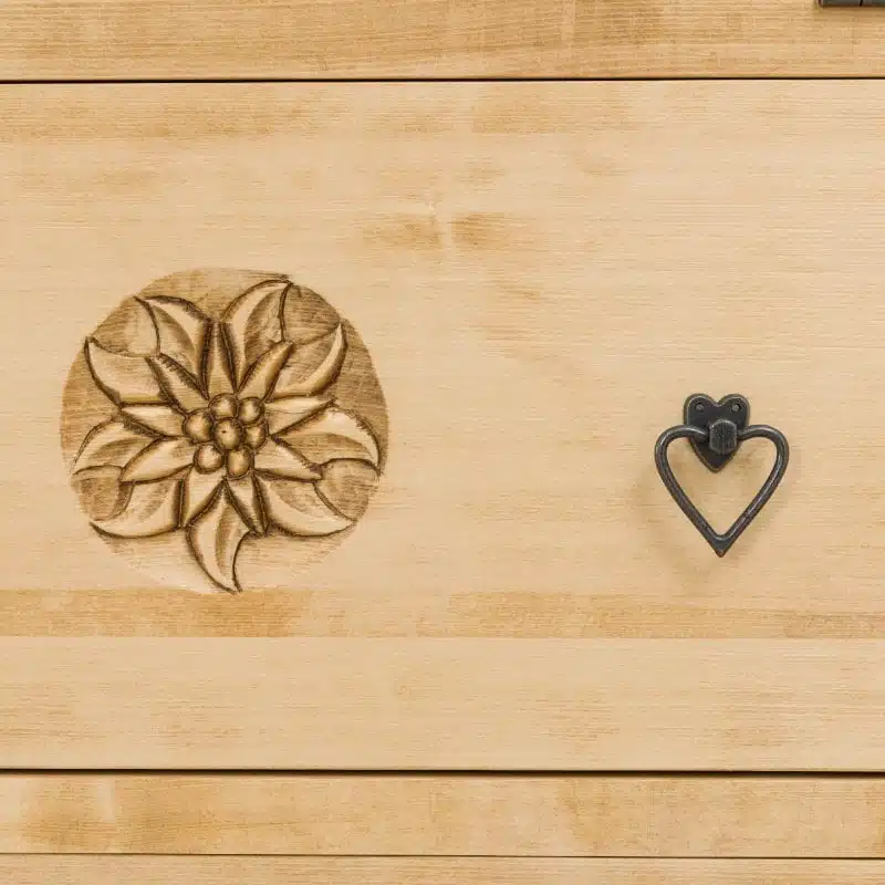 Lโambiente Chalet รจ tipico delle abitazioni di montagna. Lasciatevi incantare dai mobili di questa collezione dalle linee semplici ma impreziosite dagli intarsi fatti rigorosamente a mano e dalle particolari maniglie in ferro.
