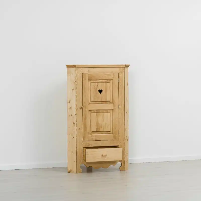 • Particolaritร :ย Pomolo in legno sul cassetto; zoccolo lavorato; misura angolo 57ร—57 xm