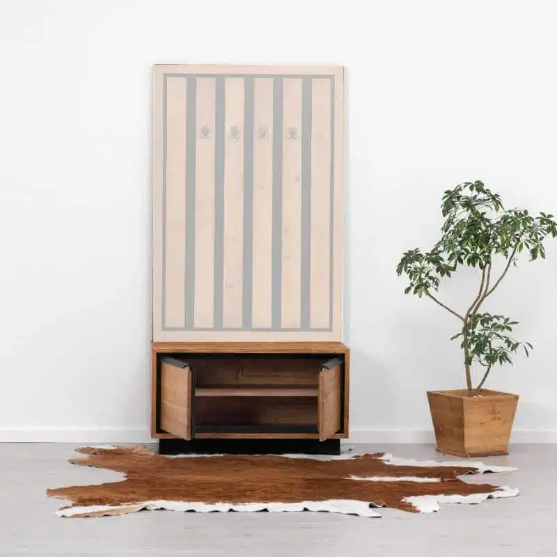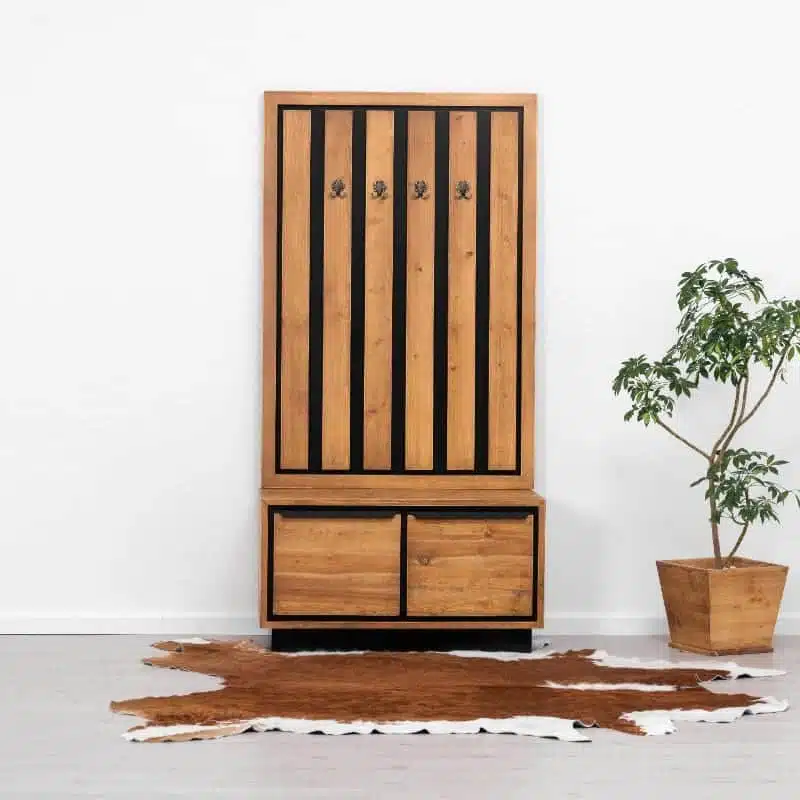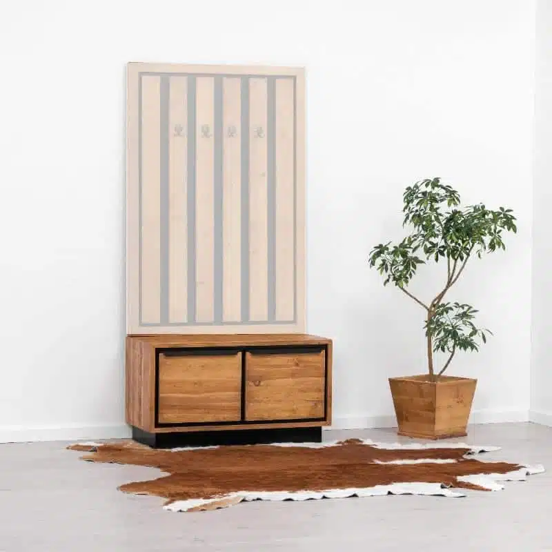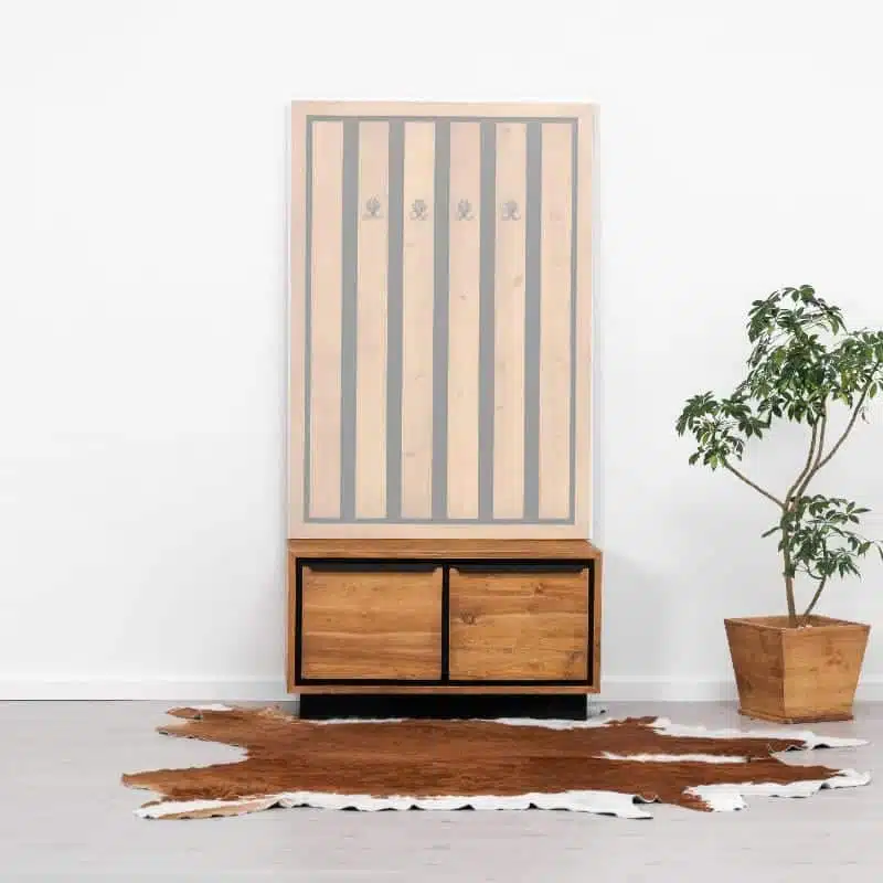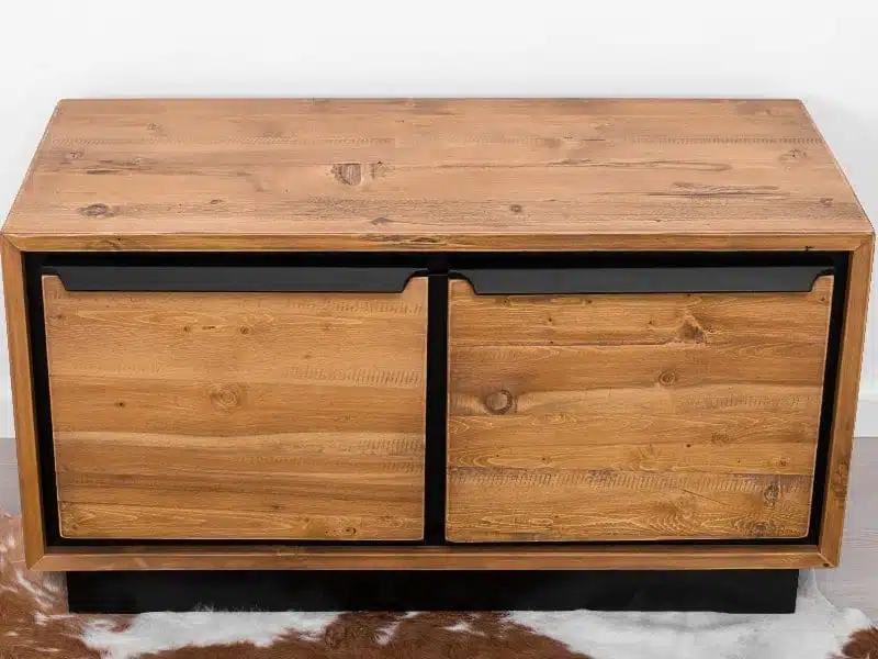 Il legno utilizzato per la produzione dei mobili presenta nodi visibili, crepe e segni di sega, che conferiscono un effetto invecchiato e rendono ogni pezzo unico. Degna di nota è la calda tonalità del legno, ottenuta tramite l’applicazione di una patina oleosa.