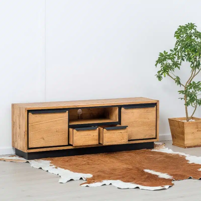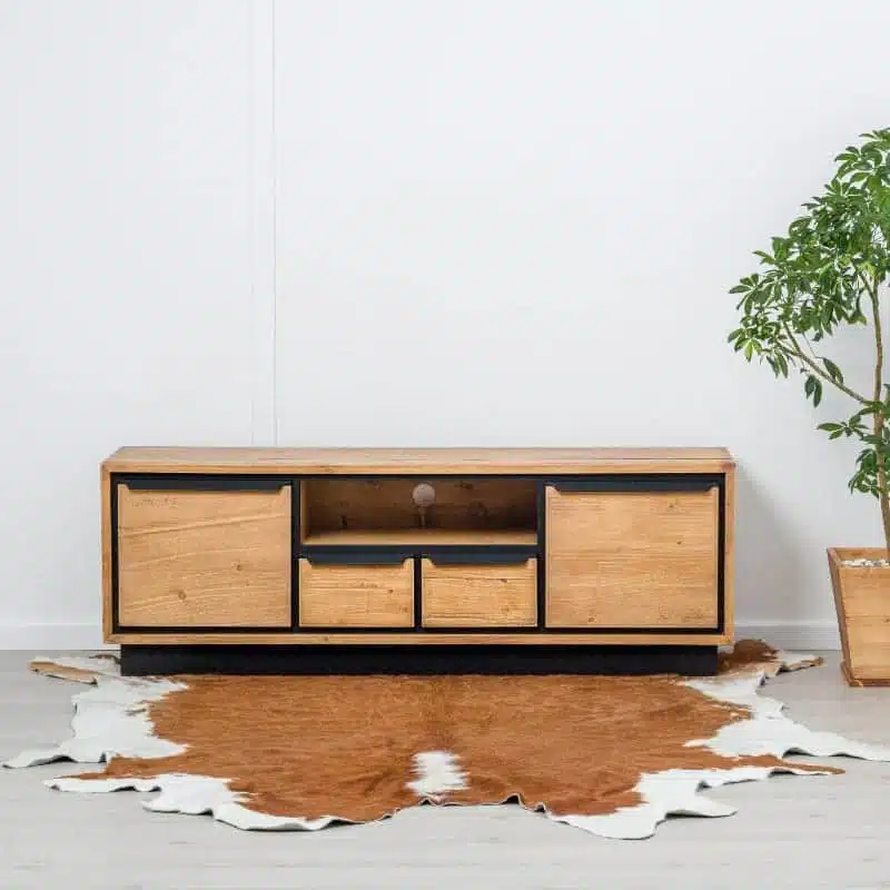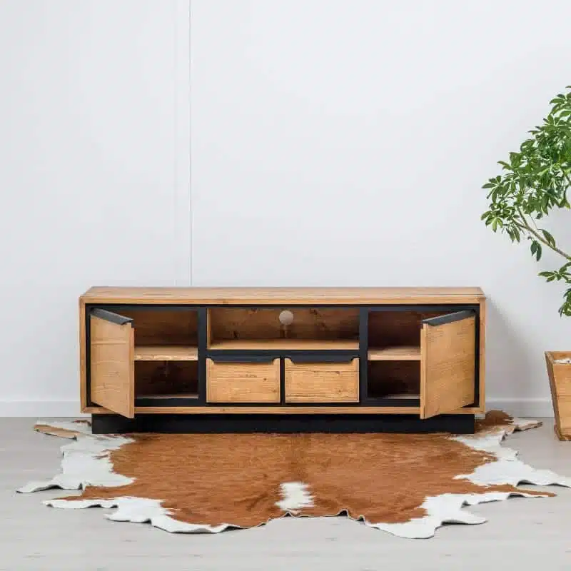 Il legno utilizzato per la produzione dei mobili presenta nodi visibili, crepe e segni di sega, che conferiscono un effetto invecchiato e rendono ogni pezzo unico. Degna di nota è la calda tonalità del legno, ottenuta tramite l’applicazione di una patina oleosa.