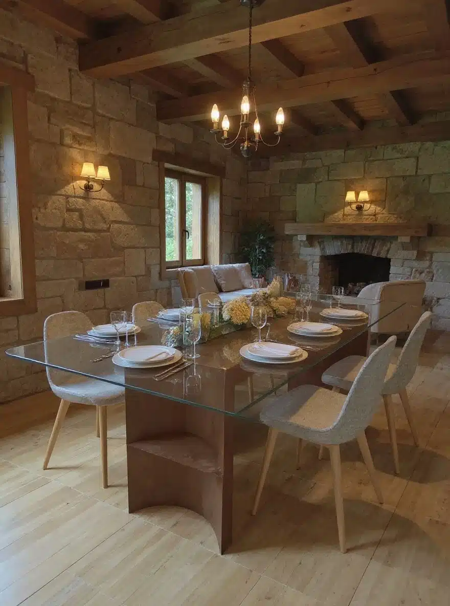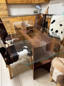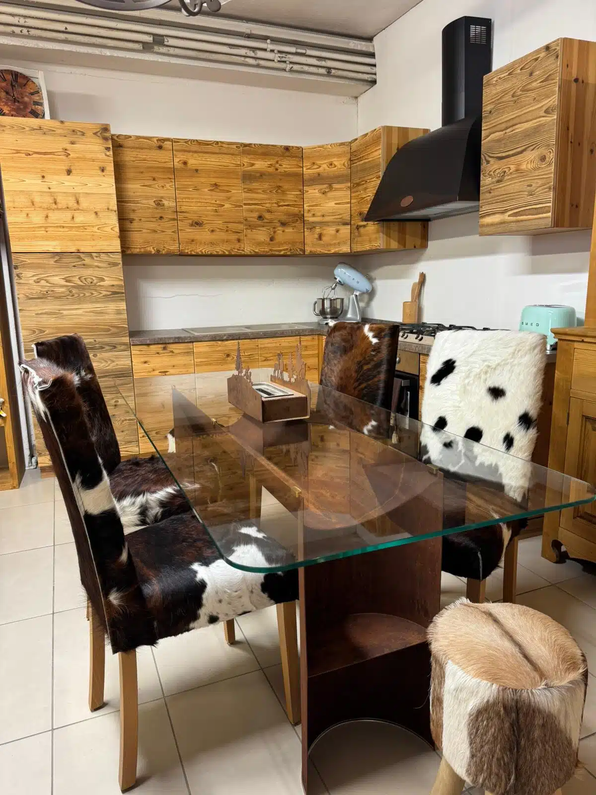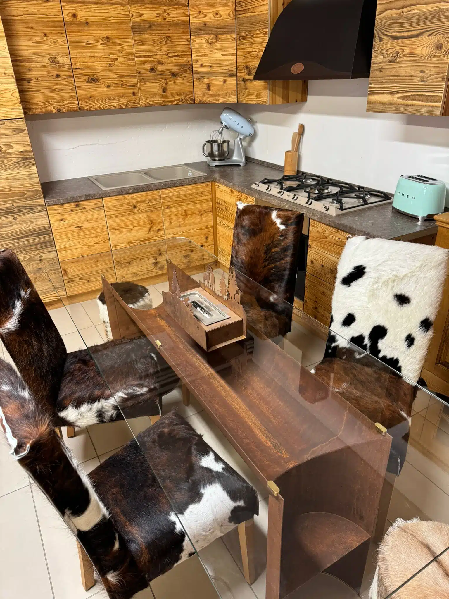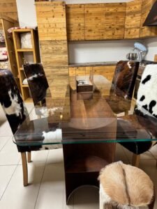 Pensato per ambienti rustici sofisticati, questo tavolo gioca con il contrasto tra l’imperfezione organica del metallo vivo e l’assoluta nitida perfezione del vetro, creando un equilibro rustico contemporaneo.