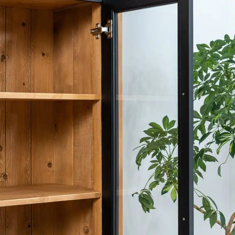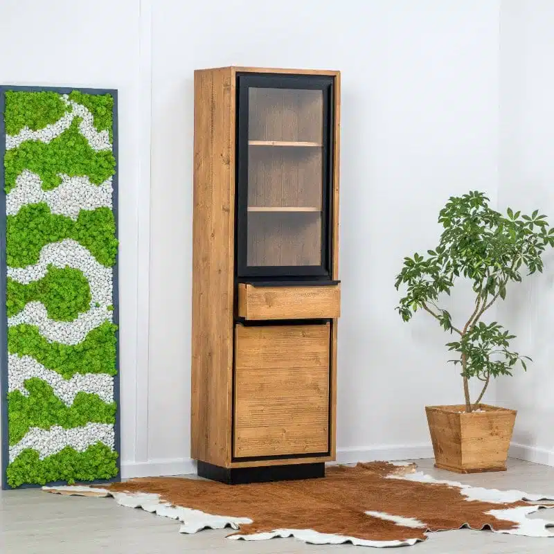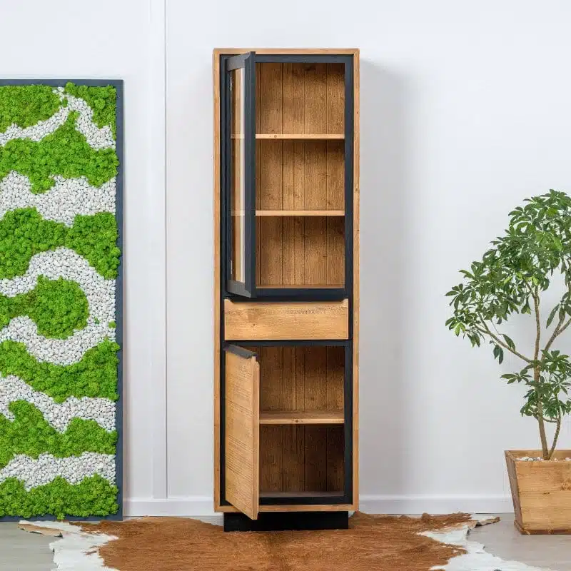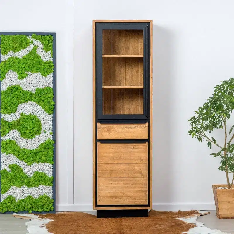Il legno utilizzato per la produzione dei mobili presenta nodi visibili, crepe e segni di sega, che conferiscono un effetto invecchiato e rendono ogni pezzo unico. Degna di nota è la calda tonalità del legno, ottenuta tramite l’applicazione di una patina oleosa.